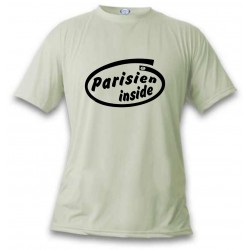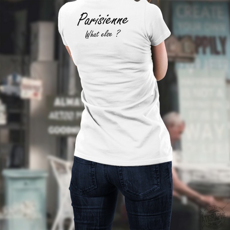 Donna T-shirt stretto illustrata con la citazione "Parisienne, What else ?", Una digressione dello slogan di George Clooney per una marca di caffè famoso