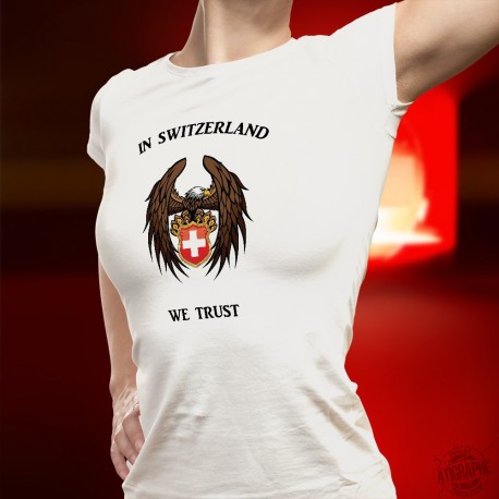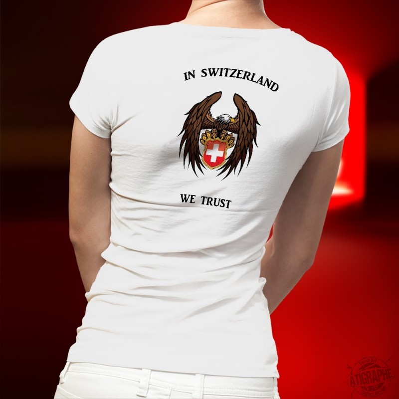 T-shirt dal taglio molto femminile, illustrata con un'aquila e stemma svizzero, così come la citazione "In Switzerland We Trust", una versione che compete con il motto americano "In God We Trust"