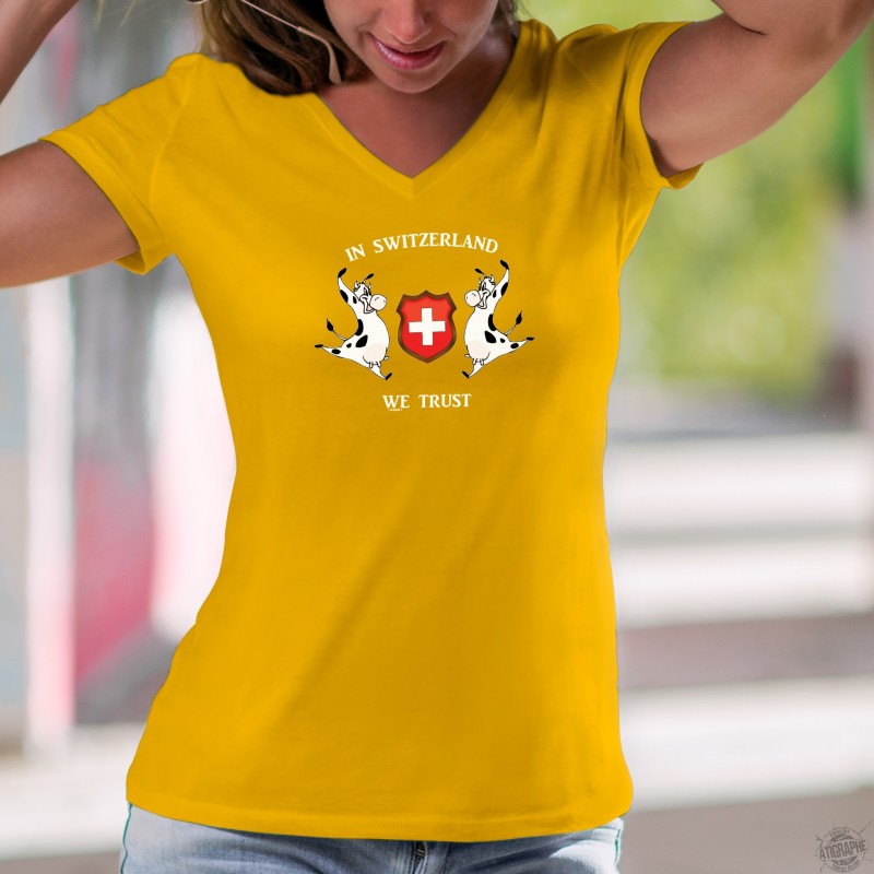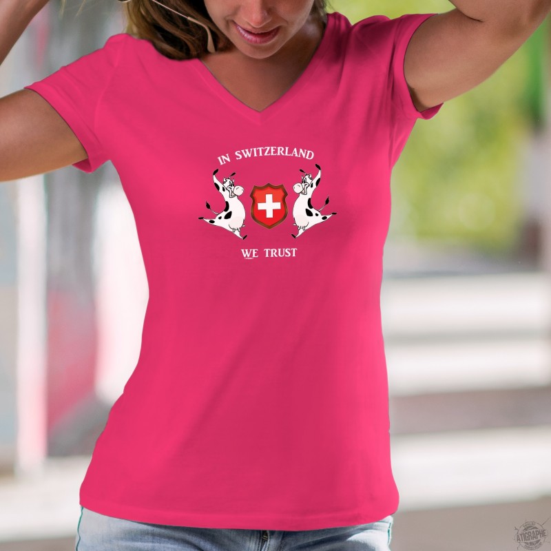 Donna moda T-Shirt, 100% cotone, illustrata con ✚ In Switzerland we Trust ✚ Crediamo in Svizzera ✚ e due mucche Holstein che circondano la cresta svizzera