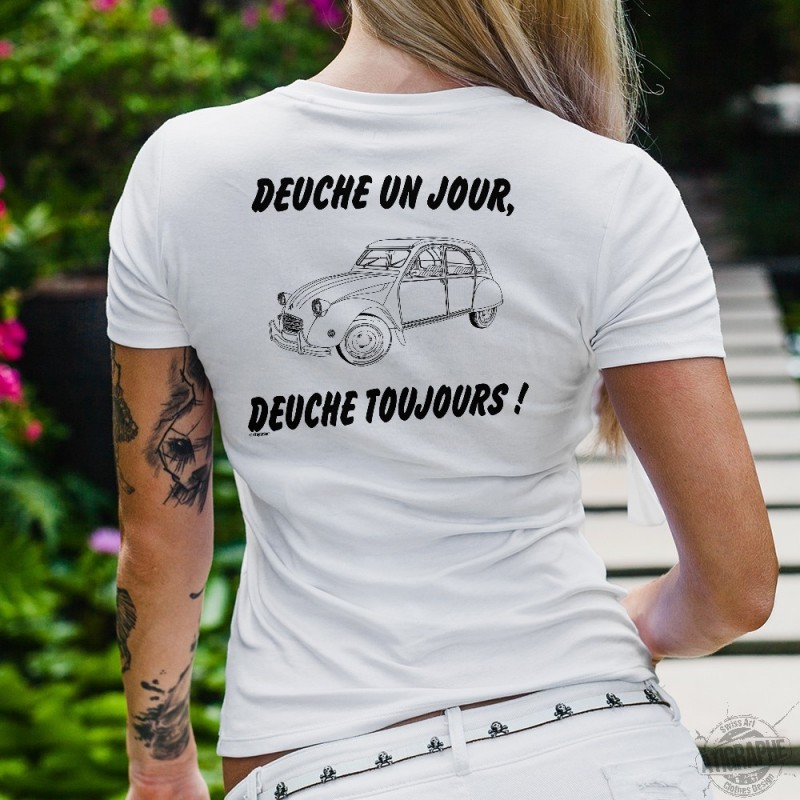 Maglietta divertente delle donne in un taglio molto femminile illustrato con un Citroën 2CV e la citazione francese "Deuche un Jour"