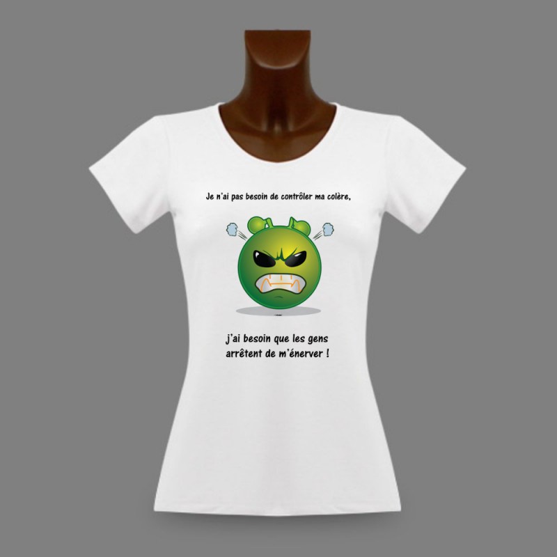 Donna moda T-shirt umoristica illustrato citando umoristico, " Je n'ai pas besoin de contrôler ma colère, j'ai besoin que les gens arrêtent de m'énerver !"