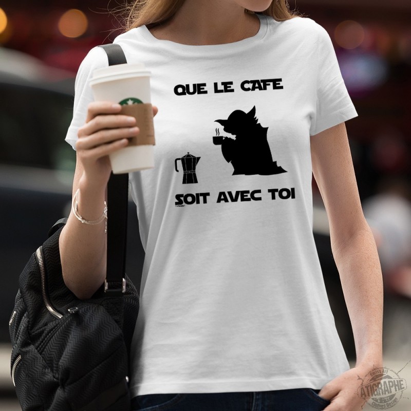 Donna T-shirt stretto illustrata con la citazione "Que le Café soit avec Toi"