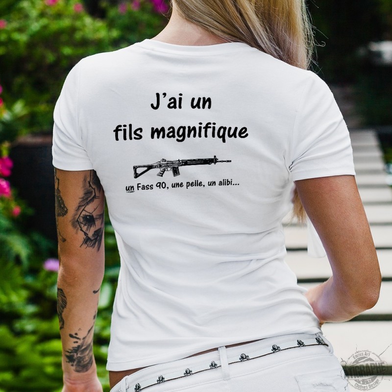 Donna T-shirt stretto illustrata con la citazione "J'ai un fils magnifique"
