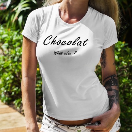Donna T-shirt stretto illustrata con la citazione "Chocolat, What else ?", Una digressione dello slogan di George Clooney per una marca di caffè famoso