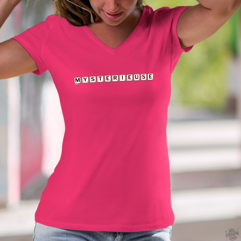 Donna moda cotone T-Shirt illustrato con la citazione francese "Mystérieuse"