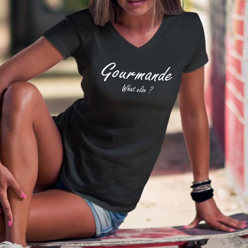 Donna T-Shirt illustrata con la citazione "Gourmande, What else ?", Una digressione dello slogan di George Clooney per una marca di caffè famoso