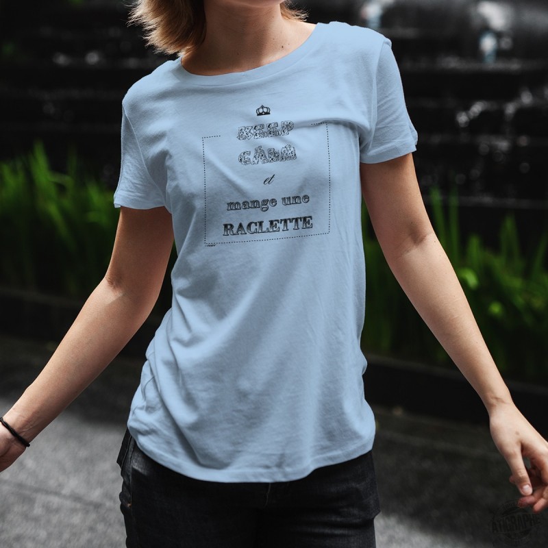 T-shirt umoristica illustrata con la frase in francese "KEEP CALM et mange une RACLETTE"