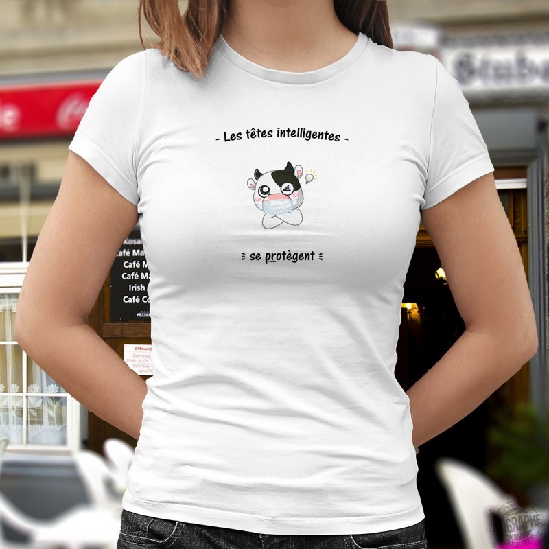 T-shirt da donna con la scritta ✪ Les têtes intelligentes se protègent ✪ vache masquée ✪