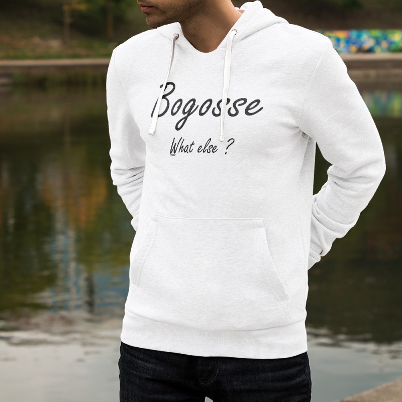 Bianco moda felpa con cappuccio illustrato con la citazione "Bogosse, What else ?" Una digressione di famosa frase di George Clooney per di marca di caffè espresso