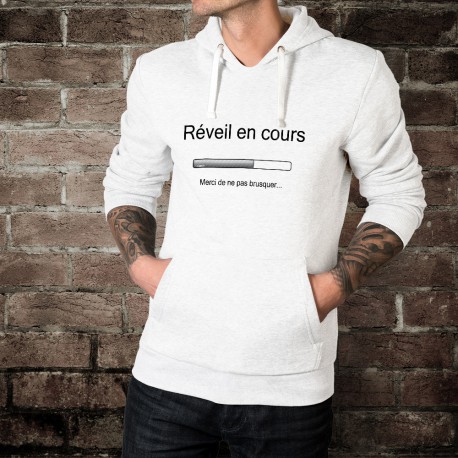 Uomo Sweat bianco a cappuccio illustrato citando umoristico francese, "Réveil en cours, merci de ne pas brusquer"