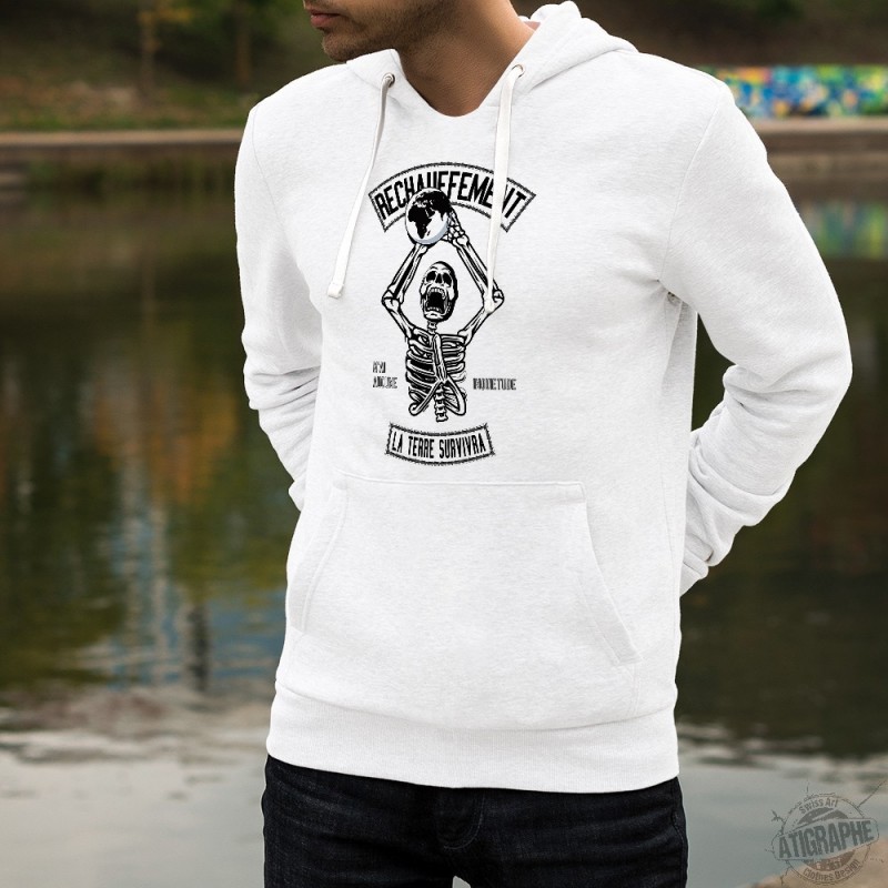 Felpa da uomo con cappuccio bianca, illustrata con "Réchauffement, la Terre survivra"