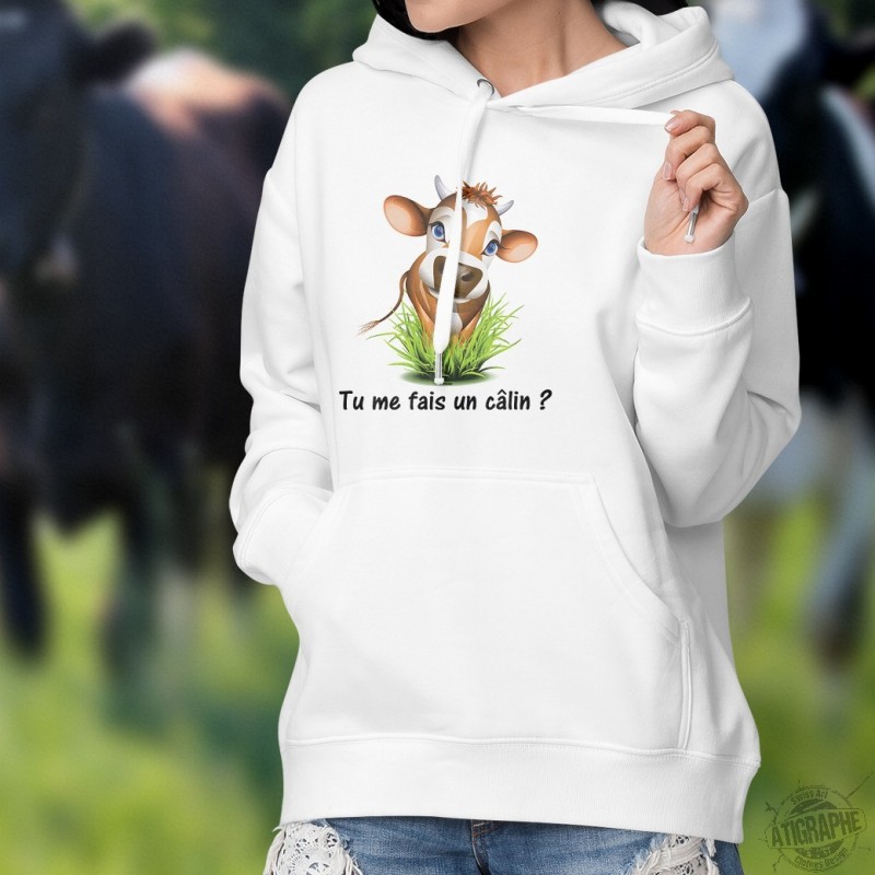 Maglione bianco con cappuccio umoristico per donna, illustrato con "Tu me fais un câlin ?"