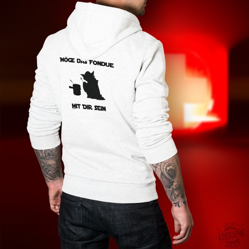 Maglione con cappuccio e libro insieme illustrato citando umoristico, "Möge das Fondue mit Dir sein" un occhiolino alla famosa replica "Che la Forza sia con te" dal film di Star Wars