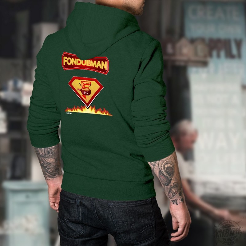 Maglione di cotone con cappuccio con i segni distintivi dei Super Eroi dei fumetti. Tu sei quello con i superpoteri, che mangia la Fondue