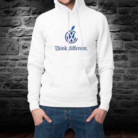 Maglione da uomo con cappuccio bianco con logo Volkswagen che ricorda una mela croccante e la frase ispirata al marchio di smartphone ★ Think different ★