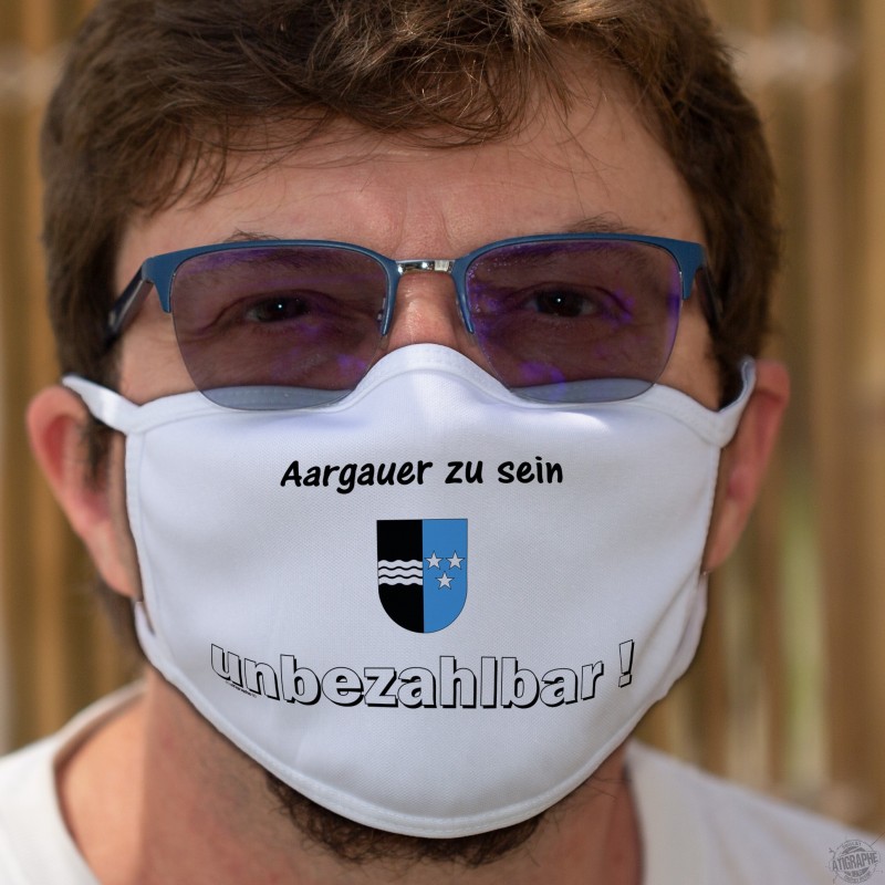 Maschera in tessuto doppio strato lavabile a 60 ° C con lo stemma del Canton Argovia e la frase tedesca ★ Aargauer zu sein, unbezhalbar! ★