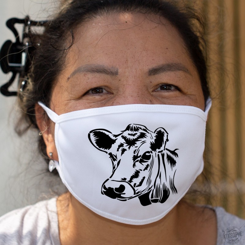 Maschera doppio strato in tessuto lavabile a 60 ° C illustrato con la sagoma della testa di una mucca in bianco e nero