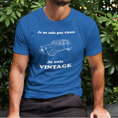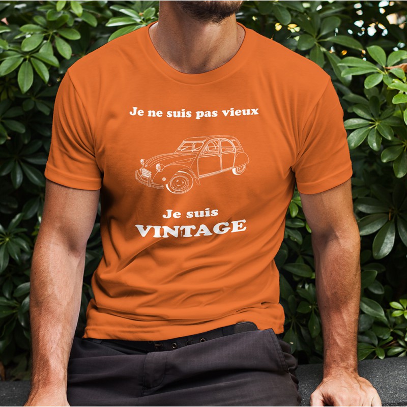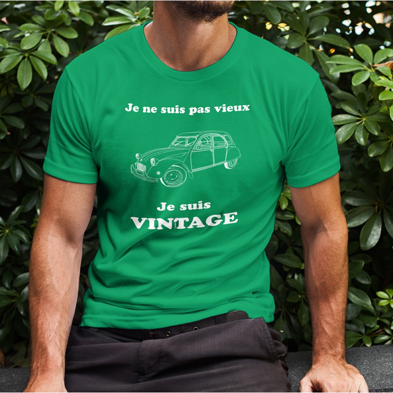 T-shirt di cotone illustrata con l'offerta humoristica francese "Je ne suis pas vieux, je suis vintage" e un Citroën 2CV