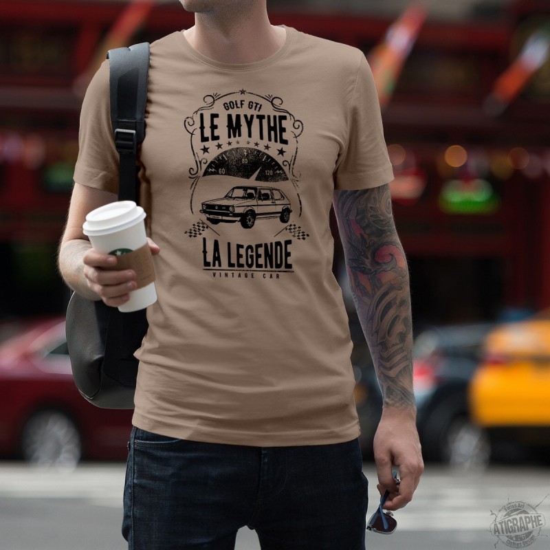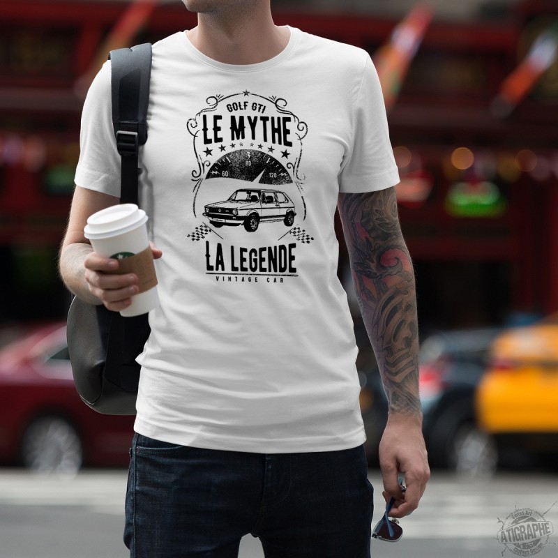 Uomo Funny T-Shirt umoristica illustrata dello slogan "Golf GTI, le mythe, la Légende" e il celebre VW Golf, versione francese