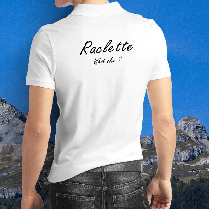Maglietta polo umoristica illustrata con la citazione "Raclette, What else ?", Una digressione dello slogan di George Clooney per una marca di caffè famoso