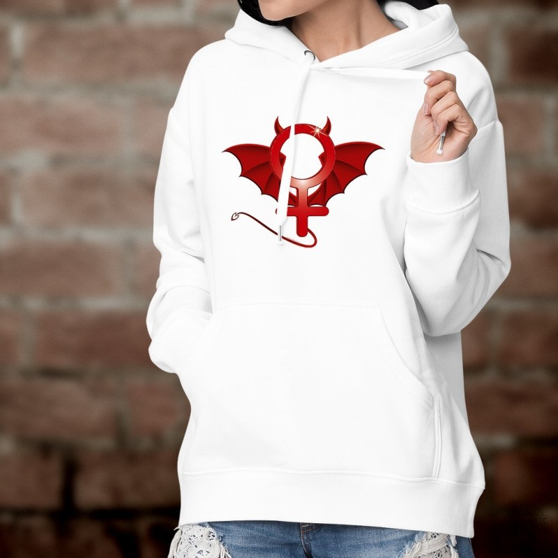 Maglione bianco, umoristico, con cappuccio illustrato con il simbolo diabolico della donna, di femminilità demonizzata in 3D