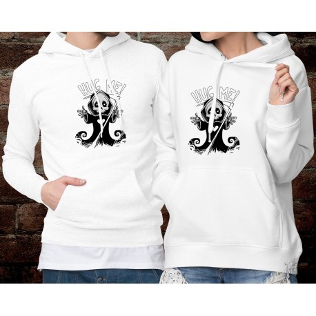 Felpa bianca umoristica per donna e uomo DUOPACK illustrato con una versione umoristica del ricercatore che cerca un abbraccio e la citazione ❤ Hug me ❤ Abbracciami ❤