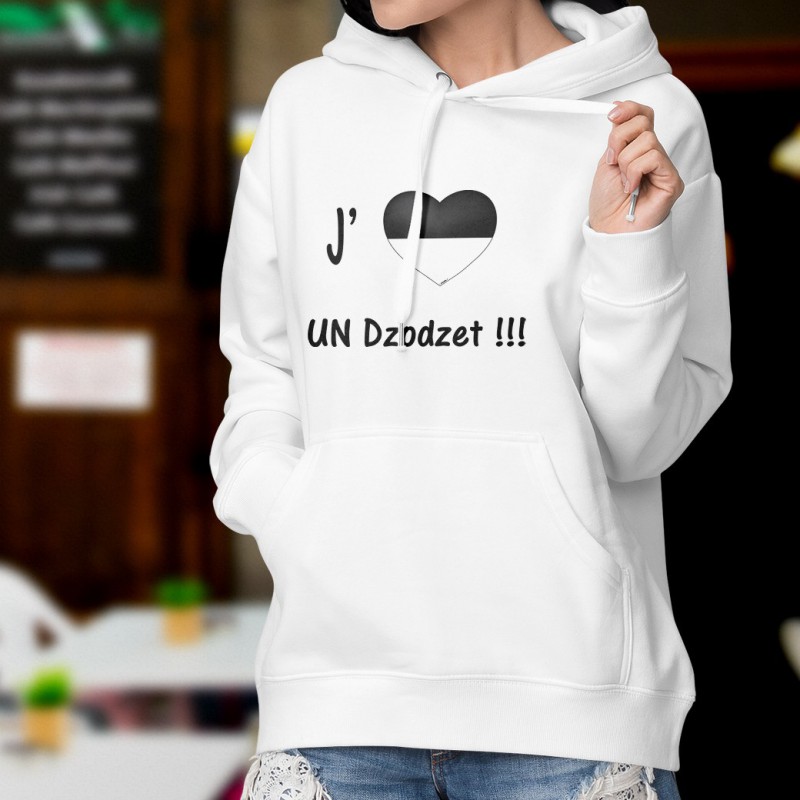 Felpa con cappuccio bianco per le signore, illustrata con la bandiera del Friburgo dello slogan in francese "J'aime UN Dzodzet"
