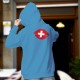 Felpa con cappuccio in cotone moda donna illustrata con labbra rosse e sontuose nei colori della Svizzera