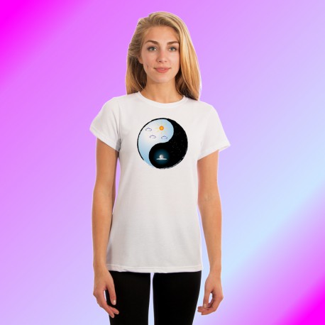 T-shirt di moda femminile in un taglio molto femminile illustrato del Yin-Yang sul tema del Sole e della Luna