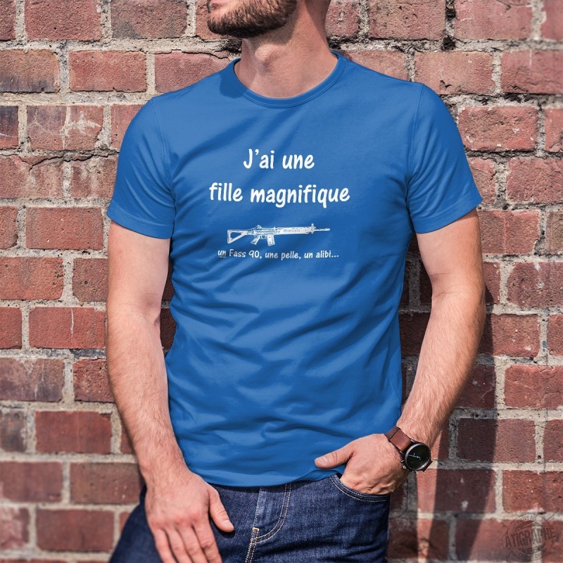 Uomo Moda cotone T-Shirt illustrato citando umoristico, "J'ai une fille magnifique, un Fass 90... ★"