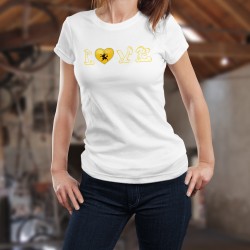 T-shirt moda per donna illustrata con graffiti reali "LOVE" fotografata alla diga del lago Schiffenen.