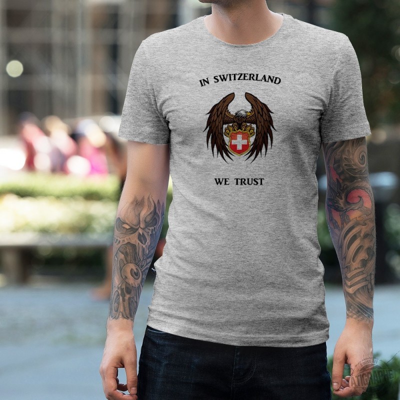 Moda Uomo T-Shirt illustrato con un'aquila, lo stemma svizzero e la citazione "In Switzerland We Trust", un nuovo adattamento del motto americano "In God We Trust"