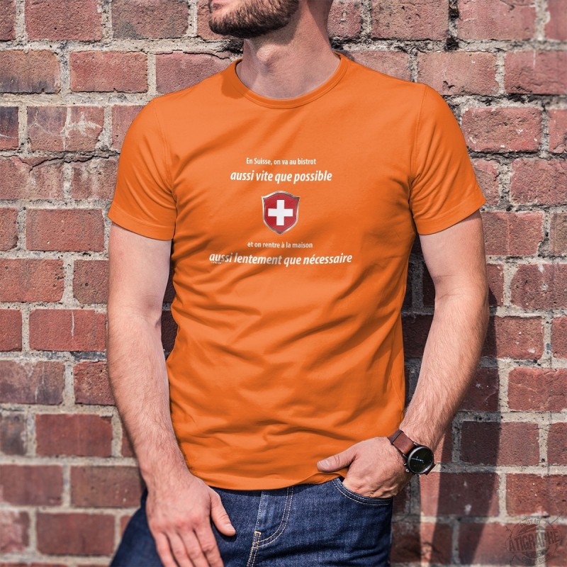T-shirt in cotone 100% illustrata con la menzione ✚ En Suisse on va au bistrot aussi vite que possible ✚