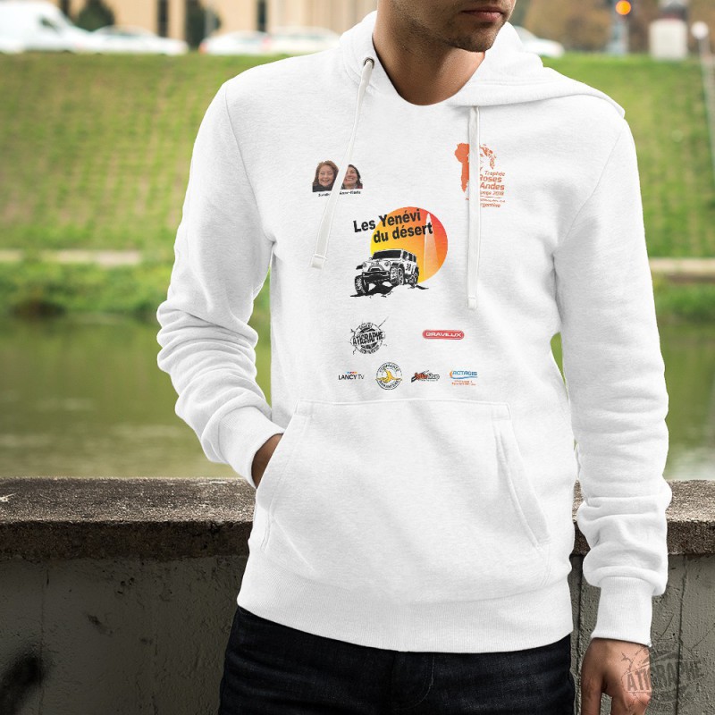 Felpa con cappuccio per Uomo illustrata del logo "Deserto Yenévi" e le "2018 Rose del Trofeo delle Ande" e sponsor che sostengono queste donne avventurose svizzere