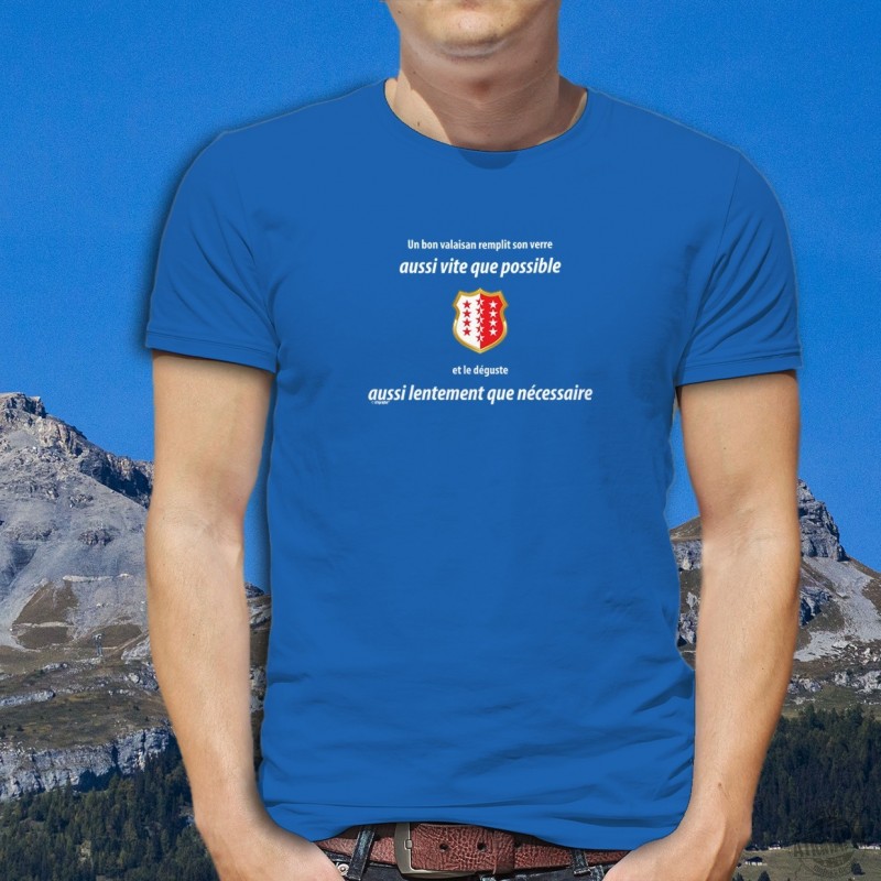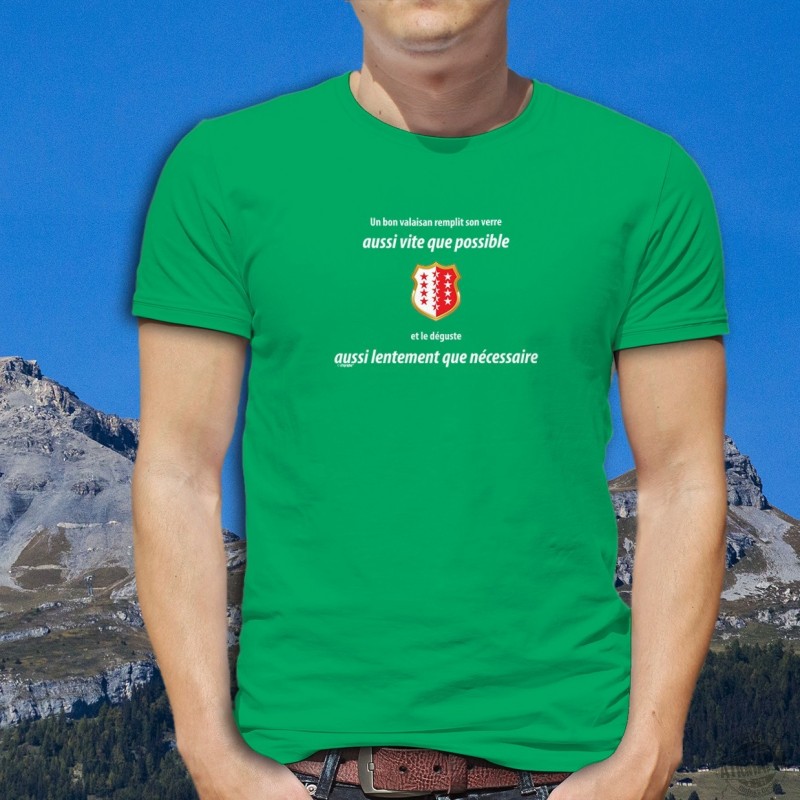 T-shirt in cotone 100% illustrata con la menzione ✚Un valaisan remplit son VERRE aussi vite que possible ✚