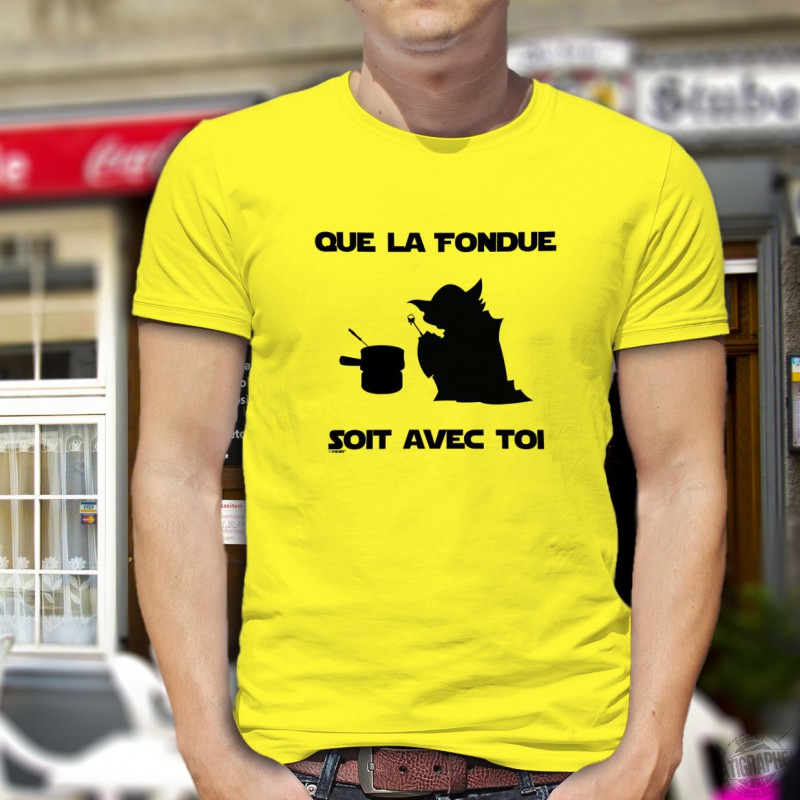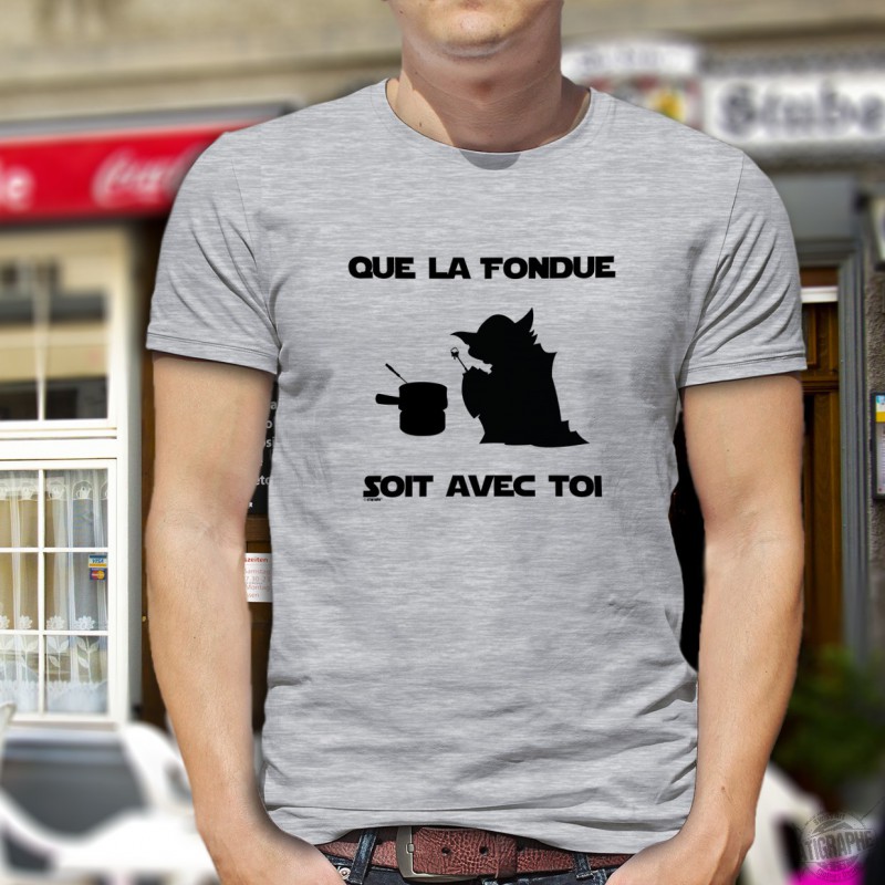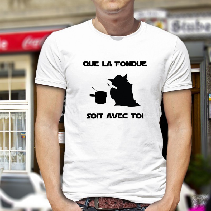 Funny T-Shirt umoristica illustrato citando umoristico, "Que la Fondue soit avec Toi" un occhiolino alla famosa replica "Che la Forza sia con te" dal film di Star Wars