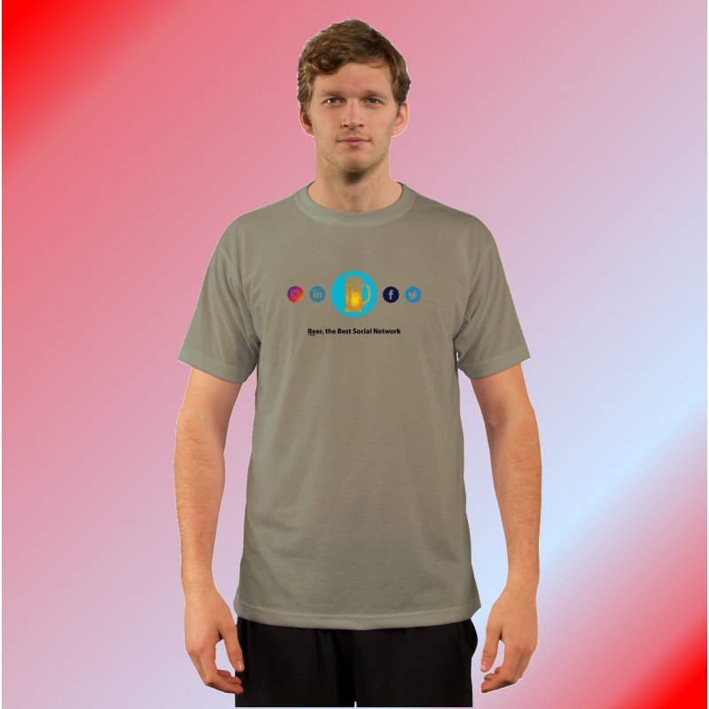 Maglietta moda umoristica da uomo illustrata con il famoso logo Twitter, Linkedin, Instagram e Facebook e la citazione inglese "Beer, the Best Social Network"