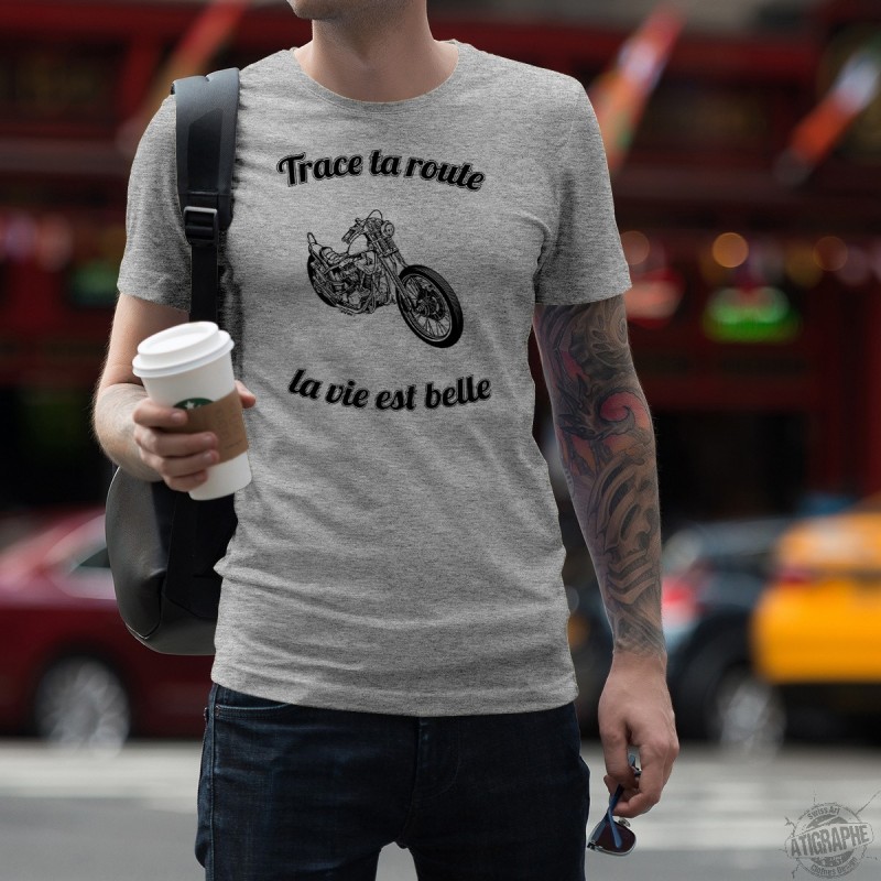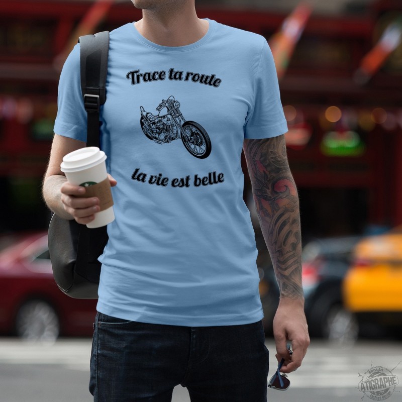 T-shirt umoristica illustrata di citazione in francese " Trace ta route, la vie est belle"
