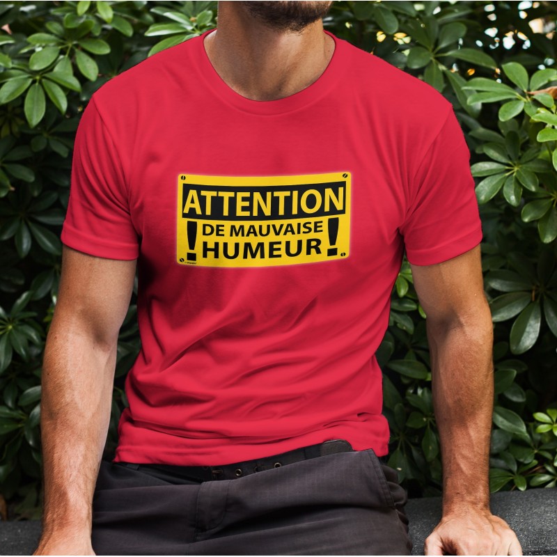 Uomo Moda cotone T-Shirt illustrato citando umoristico, "ATTENTION, de mauvaise humeur"