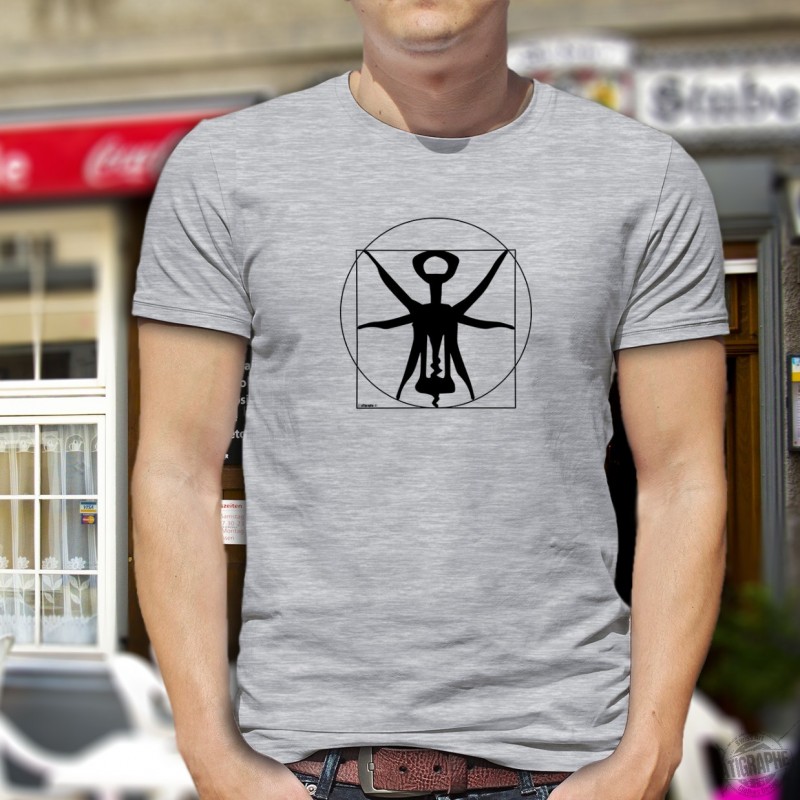 T-shirt illustrata con la rappresentazione delle proporzioni ideali del cavatappi inscritto in un cerchio e un quadrato. Nuova versione del disegno di Leonardo da Vinci