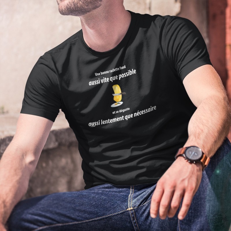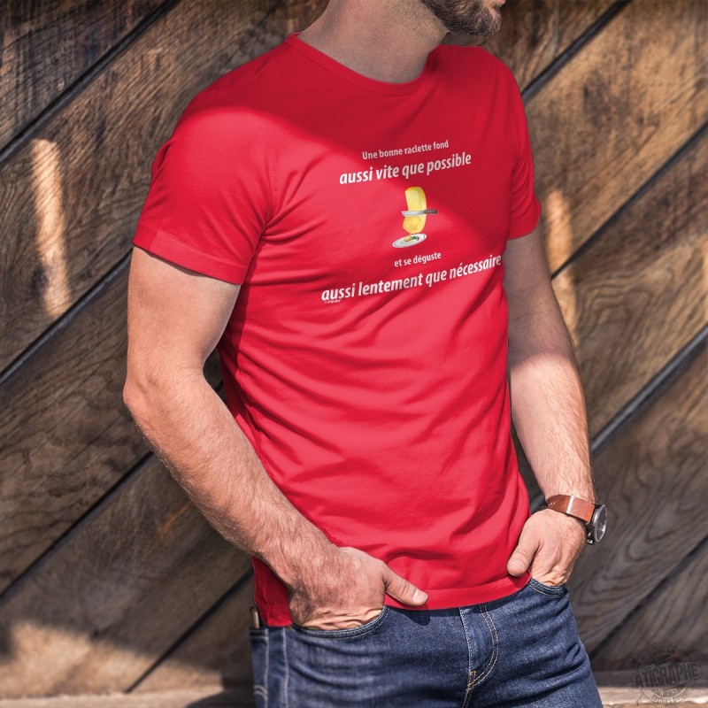 T-shirt in cotone 100% illustrata con un emblema contenente la menzione ✚ Une raclette ✚ Aussi vite que possible ✚