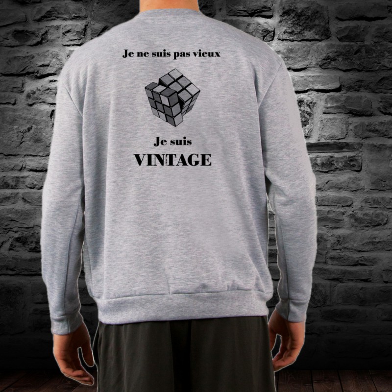 Uomo Funny Sweatshirt illustrato con un cubo di Rubik, gioco di moda negli anni ottanta e citazione umoristico "Je ne suis pas vieux, je suis vintage", versione francese
