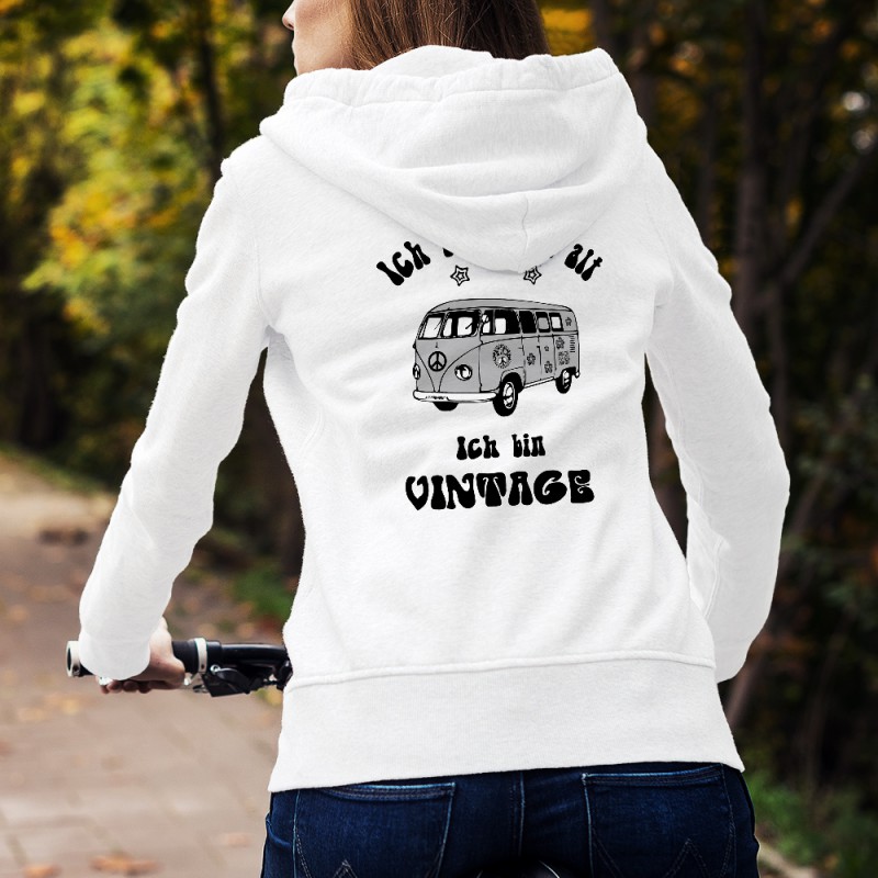 Donna Sweat bianco a cappuccio illustrata con il famoso Vintage Volkswagen Combi Flower Power e l'offerta humoristica "Ich bin nicht alt, Ich bin Vintage"